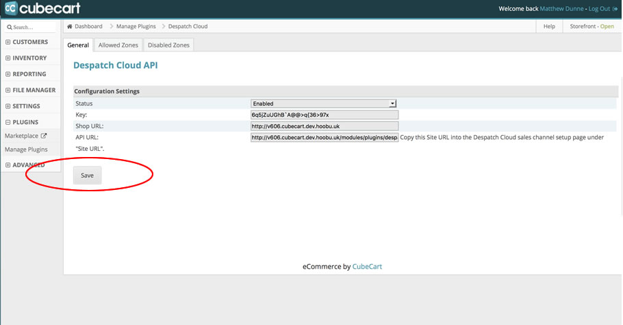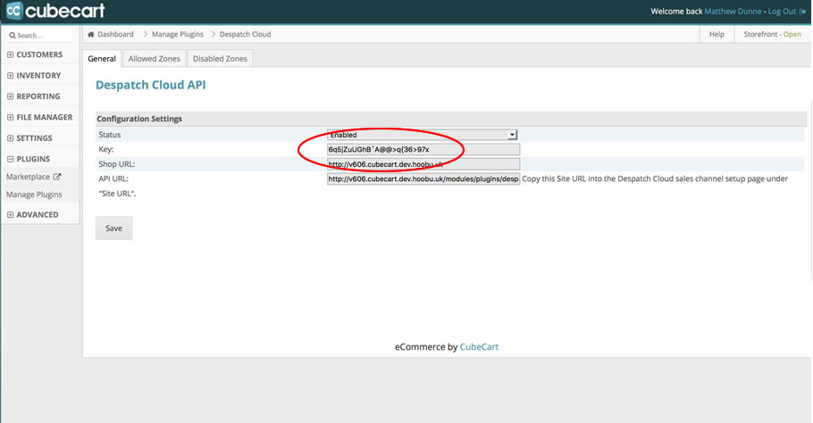 Copy the API Key and Shop URL into your Despatch Cloud account under the new CubeCart 6 store you installed in Step 4 (as below).