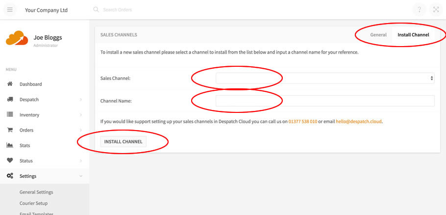 Click on the Settings > Sales Channels menu option from the left hand menu (as below).